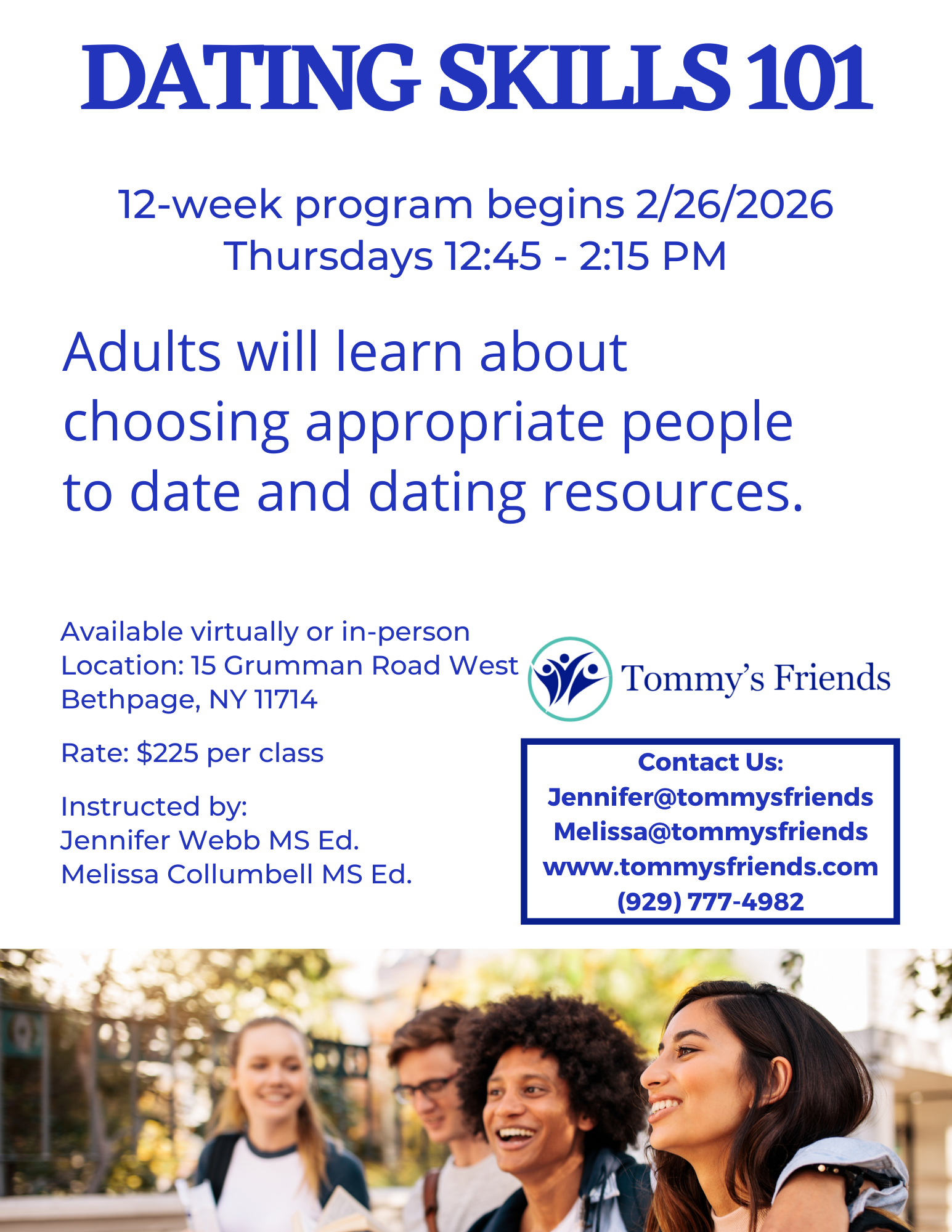Adults will learn about choosing appropriate people to date, dating resources and dating safety. Classes are available either virtually or in-person at our Bethpage location.