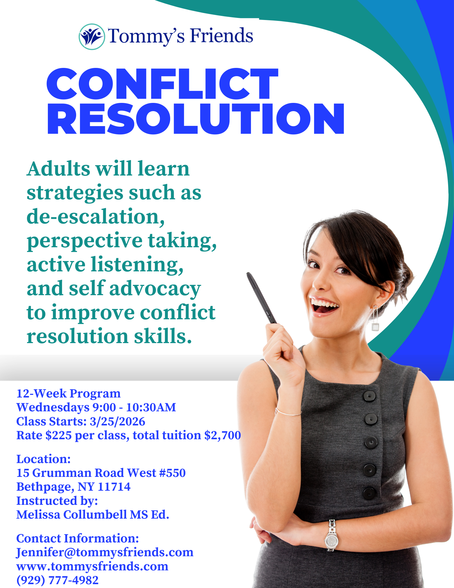 Adults will learn strategies such as de-escalation, perspective taking, active listening, and self advocacy to improve conflict resolution skills. Classes are available either virtually or in-person at our Bethpage location.
