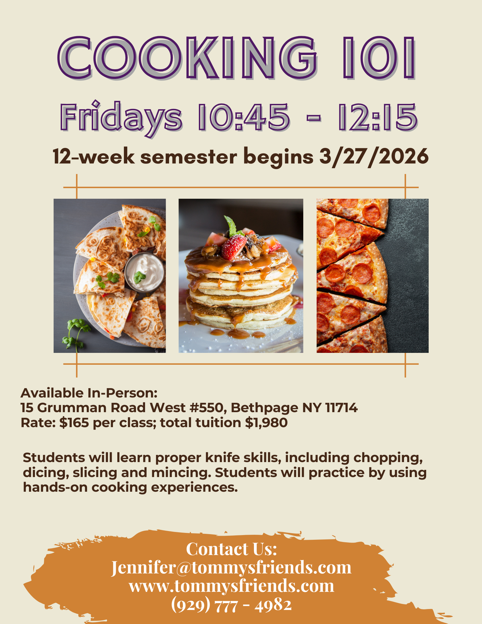 Students will learn beginner cooking techniques such as sauteing, browning, frying, steaming, roasting, and simmering. Students will practice using hands-on cooking experiences. Classes are available in-person at our Bethpage location.